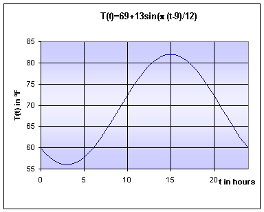 Example 3: Maximum Change in Temperature. Often the sine function is used to approximate the temperature during a day. Suppose that the coolest temperature for a day occurs at 3 am and is 56oF. If twelve hours later, the hottest temperature of 82oF occurs. Assume that the temperature, T(t) satisfies the following function: