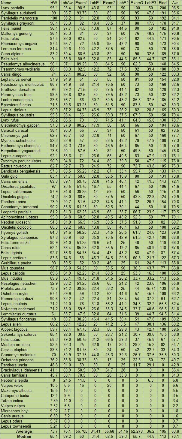 The scores will be entered after the first exam. The grade average below will be computed by adding all Lab scores and the Lab Exams counting double the Lab scores together with a weight of 0.34 , then the Lecture portion of the grade is 0.66 times a weighted average of the HW score and the Exam scores. The grade divisions are typically 85-100 is an A, 73-85 is a B, 62-73 is a C, 50-62 is a D, and below 50 is an F with + or - assigned near the boundary or a particularly high (+) or low (-) final score. You can find your Code Name by going to Blackboard to find your Code Number, then matching it against the Code Information sheet. The instructor considers the comprehensive final exam especially important in deciding the final grade, as this exam reflects what a student has learned in the course. Anyone receiving a score less than 50% on the Final will not obtain a grade higher than a C-.