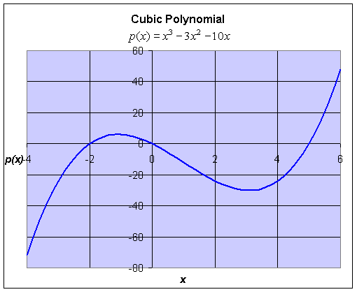 It follows that the roots of this polynomial are x = 0, -2, or 5. A graph of this cubic polynomial is below with the roots clearly visible as the x-intercepts. Later we will learn (through techniques of Calculus) to find the high point occurring at (-1.08, 6.04) and the low point occurring at (3.08, -30.04).