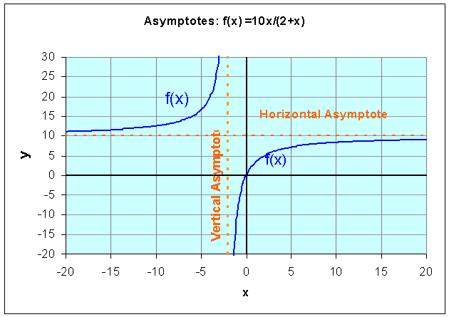 As x gets very close to -2, the function becomes undefined and the value of r(x) goes to either positive or negative infinity. (See the graph below.) Thus, x = -2 becomes a vertical asymptote. If you consider very large values of x, then the 2 in the denominator becomes insignificant, so the value of r(x) approaches 10x/x = 10. This becomes the horizontal asymptote. The graph below shows r(x) with its vertical and horizontal asymptotes.