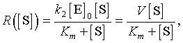 where [S] is the substrate concentration and V and Km are kinetic constants determined by the reaction given above. The constant V (also commonly denoted Vmax) is called the maximal velocity of the reaction. Km is the Michaelis constant, and its value is the value of the substrate concentration at which the reaction achieves half of the maximum velocity. This function R is a rational function.