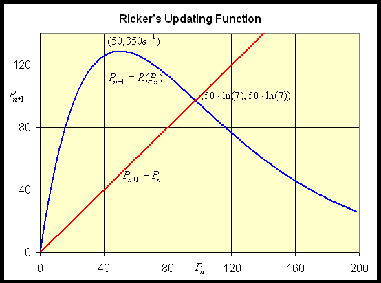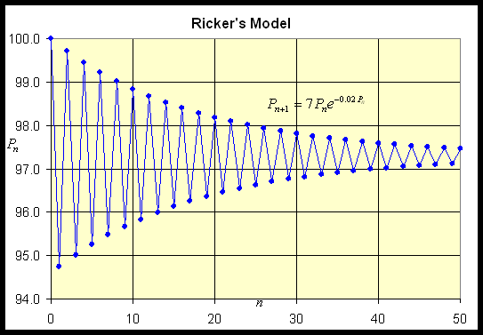 Example 4: Let Pn be the population of fish in any year n. Consider Ricker's model for population growth given by the equation