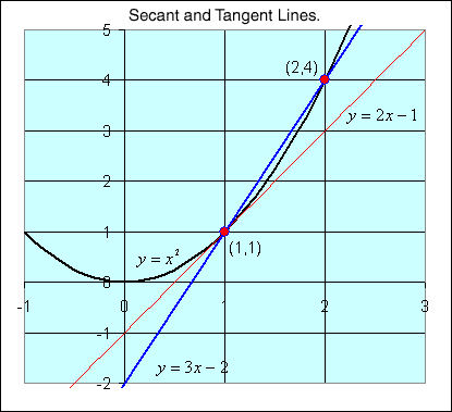 Next consider the pair of points on the curve y = x2, (1,1) and (1.5, 2.25). This line has a slope of m = 2.5, and its equation is y = 2.5x - 1.5. If we examine the secant line through the points (1,1) and (1.1, 1.21), then this line has a slope of m = 2.1, and its equation is y = 2.1x - 1.1.