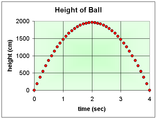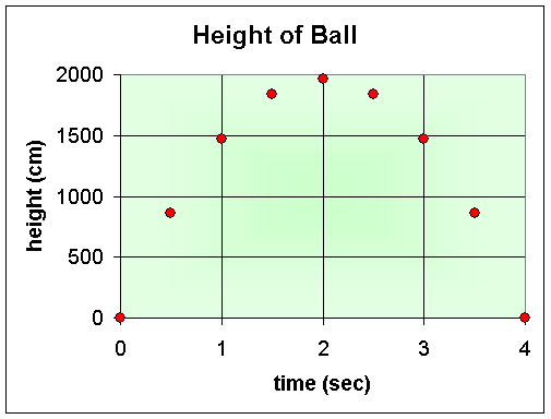 If we graph the height of the ball h(t) over the first 4 seconds, showing the ball at every 0.5 sec (as if the ball were viewed with a strobe light), then the ball's height would appear as in the graph below. (Notice the actual flight goes up, then comes down, so we are looking at snapshots in time (the horizontal axis).