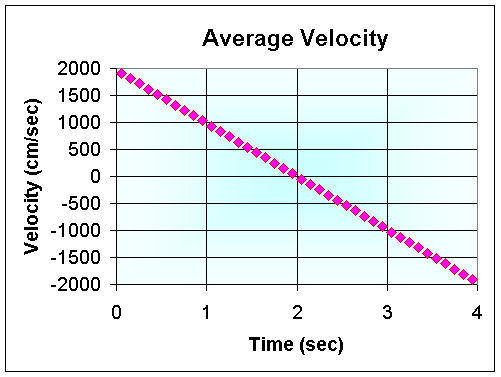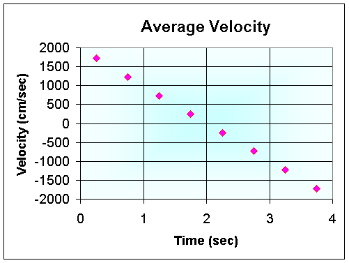 A graph of all the average velocities is shown below. The graph of the height of the ball is clearly a parabola, while the graph of the average velocities is a straight line. Notice that the straight line seems to have an average velocity of zero at the same time as the height of the ball reaches its maximum. We would expect that the velocity goes to zero when the ball is at the top of its flight.