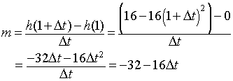 Suppose the we could monitor the height for a small increment of time after t = 1, say t = 1 + Dt. The slope of the secant line between the heights at t = 1 and t = 1 + Dt is given by