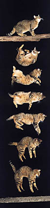 Humans have been fascinated by this ability of a cat to right itself so quickly from a fall. There have been quite a few scientific studies of cats falling. One study of cats falling out of New York apartments showed that paradoxically the cats falling from the highest apartments actually fared better than ones falling from an intermediate height. Apparently, the cat first rights itself rapidly during a fall, but remains tense. However, with greater heights the falling cat relaxes and actually spreads its legs to form more of a parachute, which slows its velocity a little and results in a more even impact. From intermediate heights, the cat basically achieves terminal velocity (from the air resistance balancing the force of gravity), but the tension and the stiffness seems to cause increased likelihood of severe or fatal injuries.