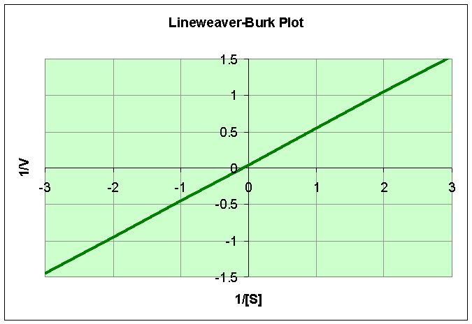 The slope of this line is Km/Vmax, the y-intercept is 1/Vmax, and the x-intercept is -1/Km. Below is a graph of this straight line, the Lineweaver-Burk plot.